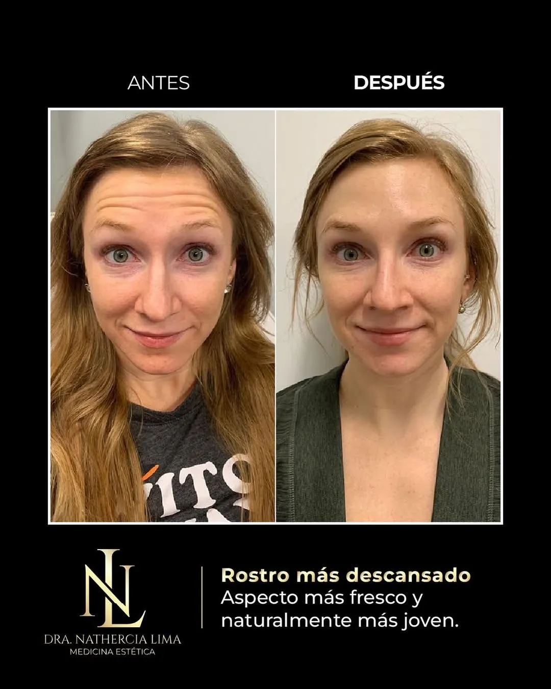 Rostro más joven: Las líneas en frente, entrecejo y ojos se suavizan en una sola sesión